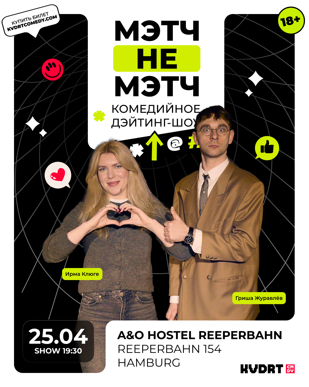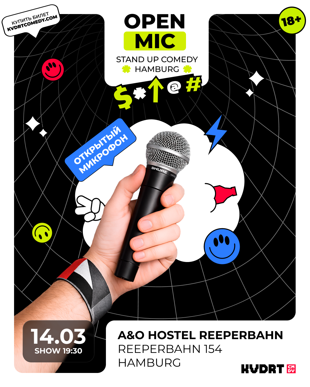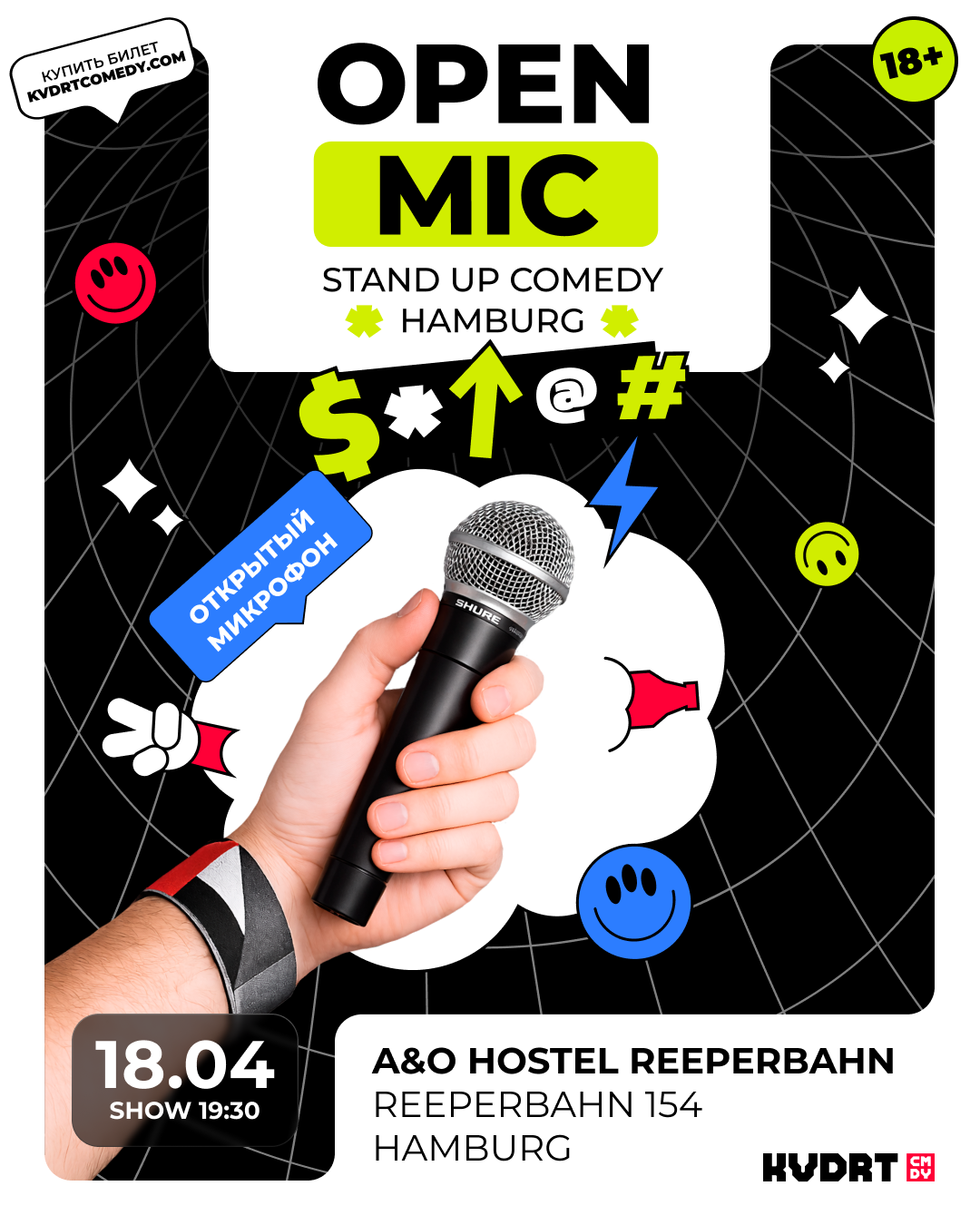 KVDRT COMEDY — это творческая банда смешных людей, со своими собственными концертами, разноформатными комедийными шоу и гастролями знаменитых комиков. Несколько раз в месяц мы выступаем в Гамбурге — и с аппетитом заглядываемся на выездные мероприятия в другие города Европы.